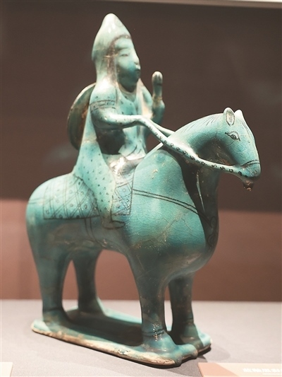 綠松石色釉小型樂(lè)隊(duì)模型為公元12—13世紀(jì)的作品,其結(jié)構(gòu)呈方形,表現(xiàn)了樂(lè)隊(duì)演奏或宴會(huì)場(chǎng)景,11名樂(lè)手分別演奏鐃鈸、鼓、琴、長(zhǎng)笛等樂(lè)器,場(chǎng)地中央置一果盤。藍(lán)釉黑彩騎士陶塑刻畫了具有東亞特征面孔的騎士形象。騎士頭戴尖頂帽,背負(fù)盾牌,其造型受到中國(guó)藝術(shù)的影響。
