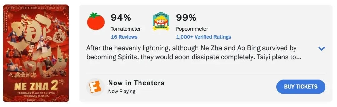 不僅打破了多項票房紀錄,《哪吒2》更以IMDb評分8.2分、爛番茄新鮮度94%、爆米花指數(shù)99%的口碑,讓世界看見中國電影的工業(yè)實力與文化魅力。