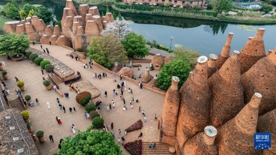人們?cè)谠颇鲜〖t河州彌勒市東風(fēng)韻小鎮(zhèn)游玩(無人機(jī)照片,4月5日攝)。