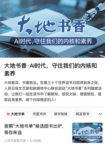 習(xí)近平總書記在今年全國兩會期間的重要講話中指出“書香是一種氛圍”“數(shù)字閱讀要和傳統(tǒng)閱讀結(jié)合起來,守住我們的內(nèi)核和素養(yǎng)”。在第三十個世界讀書日即將到來之際,人民日報社文藝部和新媒體中心聯(lián)合啟動“大地書香”系列融媒活動,并圍繞“AI時代,守住我們的內(nèi)核和素養(yǎng)”推出首期“大地書單”。來自出版、文藝、科技、教育等不同領(lǐng)域的20位薦書人,推薦出35本候選圖書,在人民日報客戶端“大地書香”專題予以集中呈現(xiàn),參照網(wǎng)友的評論與推薦,最終推選出10本上榜圖書。讓我們多讀書、讀好書,一起在氤氳著書香的大地上行穩(wěn)致遠。