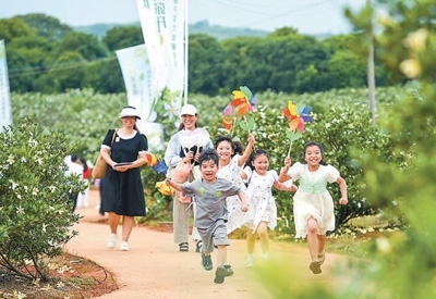 江西省樟樹市義成鎮(zhèn)羅港村黃梔子種植基地,游客在賞花游玩。