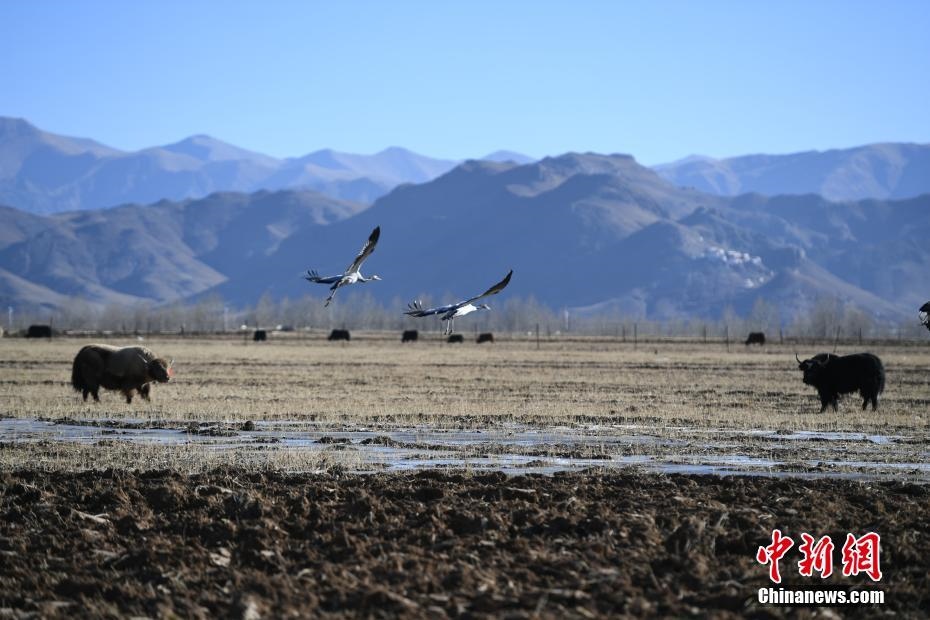 12月20日,黑頸鶴在西藏拉薩市林周縣虎頭山水庫(kù)周邊的冬灌地里棲息。嚴(yán)冬時(shí)節(jié),拉薩河谷沿線的草甸、山巒、候鳥、寺廟構(gòu)成一道獨(dú)特的風(fēng)景線。 中新社記者 貢嘎來(lái)松 攝