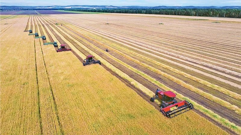 實施鄉(xiāng)村振興戰(zhàn)略,必須把確保重要農產品特別是糧食供給作為首要任務,把提高農業(yè)綜合生產能力放在更加突出的位置,把“藏糧于地、藏糧于技”真正落實到位。圖為2022年8月17日,大型秋收機械在內蒙古呼倫貝爾農墾牙克石農牧場有限公司第四連(隊)集群割曬作業(yè)。人民圖片王國印/攝