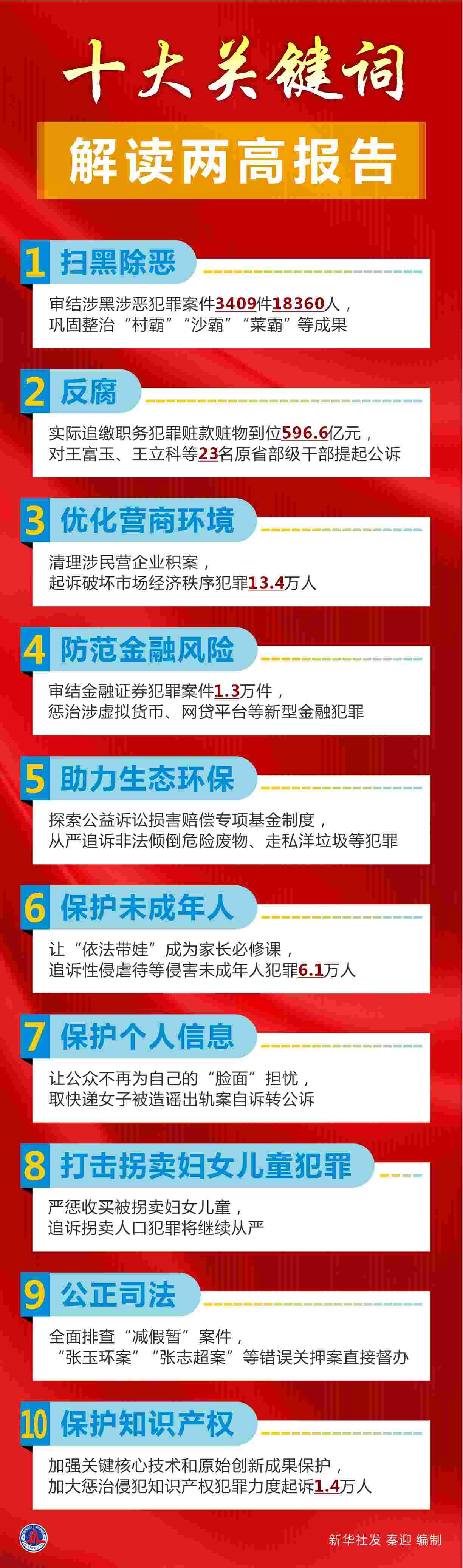 兩高報告凸顯依法治國的決心與力度。點名秦光榮、王富玉、王立科等落馬腐敗分子,提及陶革涉黑案、張玉環(huán)案、取快遞女子被造謠出軌案等引發(fā)社會關注的案件。常態(tài)化掃黑除惡、高壓反腐、打擊拐賣婦女兒童犯罪、保護公民個人信息等法治重點,與群眾關切高度契合。