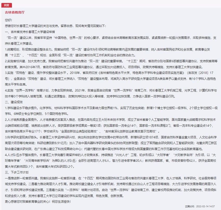 吉林省教育廳回復(fù)了網(wǎng)友的留言,并對吉林省高校建設(shè)工作進(jìn)行了詳細(xì)闡述。