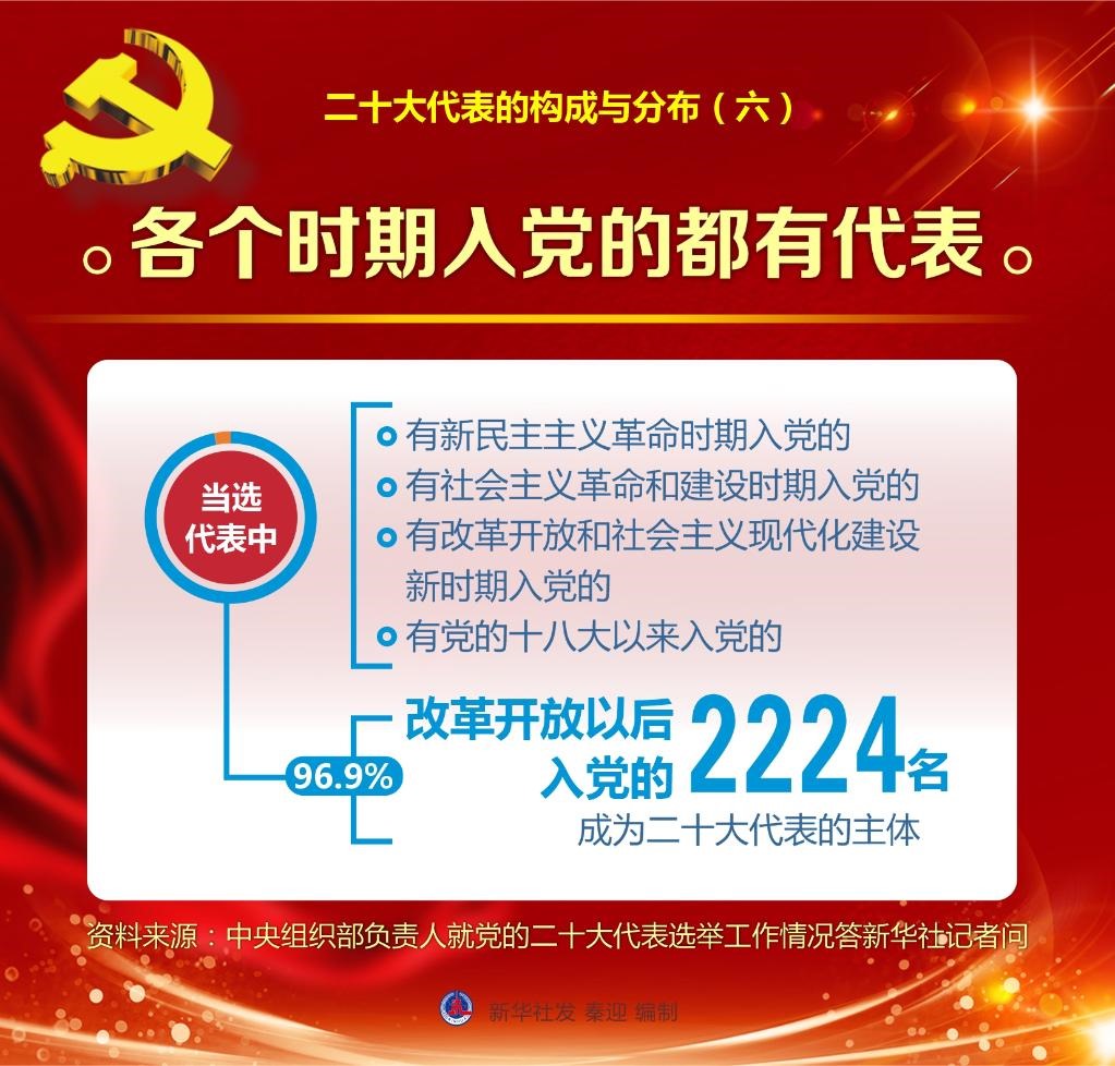 六是各個時期入黨的都有代表。當選代表中,有新民主主義革命時期入黨的,有社會主義革命和建設時期入黨的,有改革開放和社會主義現(xiàn)代化建設新時期入黨的,有黨的十八大以來入黨的。其中,改革開放以后入黨的2224名,占96.9%,成為二十大代表的主體。
