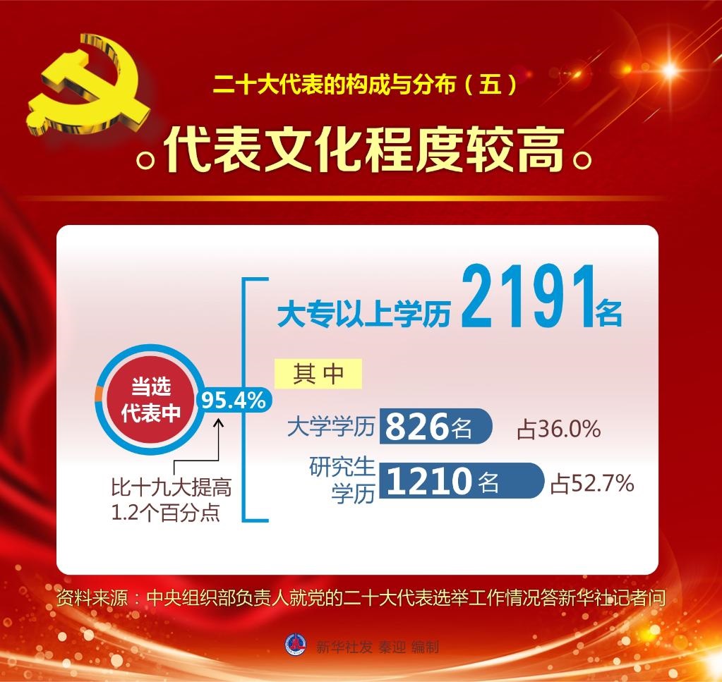 五是代表文化程度較高。當選代表中,大專以上學歷的2191名,占95.4%,比十九大提高1.2個百分點。其中,大學學歷的826名,占36.0%;研究生學歷的1210名,占52.7%。