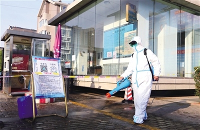 在萬(wàn)錦·領(lǐng)秀小區(qū)門口,城管工作人員在警戒線內(nèi)正在消殺市民給小區(qū)居民送來(lái)的物品?!靶^(qū)目前處于封閉狀態(tài),小區(qū)內(nèi)有蔬菜超市,可以滿足市民的正常餐食問(wèn)題。目前還有一些市民也會(huì)給小區(qū)居民送來(lái)一些日常用品,我們會(huì)把這些物品消殺后送進(jìn)小區(qū)?!毙^(qū)門口的工作人員說(shuō)。