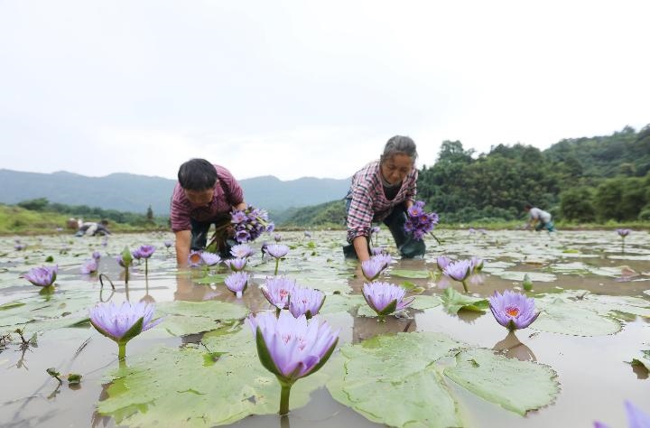 2022年6月28日,在貴州省赤水市寶源鄉(xiāng)玉豐村,村民在采摘香水蓮花。近年來(lái),貴州省赤水市寶源鄉(xiāng)采取“黨支部+合作社+農(nóng)戶(hù)”模式,引導(dǎo)農(nóng)民種植集觀賞、藥用、食用為一體的香水蓮花,帶動(dòng)農(nóng)民增收,助力鄉(xiāng)村振興。新華社發(fā)(王長(zhǎng)育 攝)