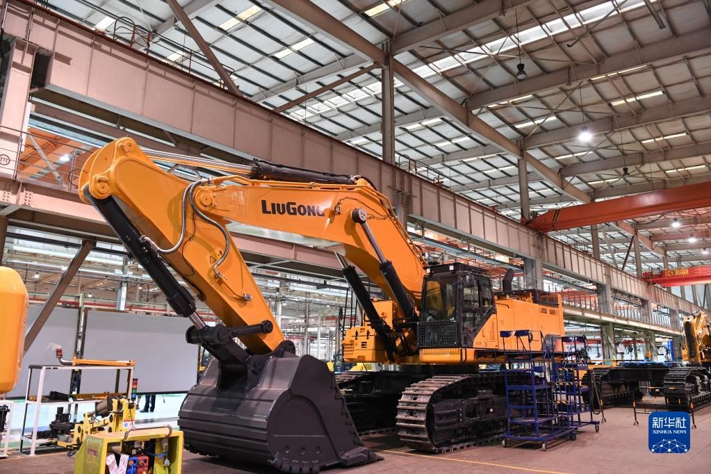 這是廣西柳工集團有限公司生產(chǎn)廠房內(nèi)正在組裝的機械(2021年4月26日攝)。新華社記者 曹祎銘 攝