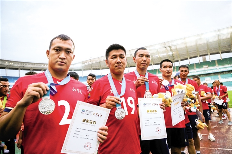 7月26日,內(nèi)蒙古隊球員展示銀牌。當(dāng)日,第十四屆全國運動會群眾比賽足球項目十一人制男子農(nóng)村鄉(xiāng)鎮(zhèn)組決賽在大雨中開戰(zhàn)。最終經(jīng)過90分鐘的爭奪,代表內(nèi)蒙古出戰(zhàn)的錫尼河鎮(zhèn)隊與陜西隊戰(zhàn)成1:1平,在隨后進行的點球大戰(zhàn)中,內(nèi)蒙古隊2:4不敵對手,獲得該項目的亞軍。(攝影/北方新報正北方網(wǎng)記者 牛天甲)