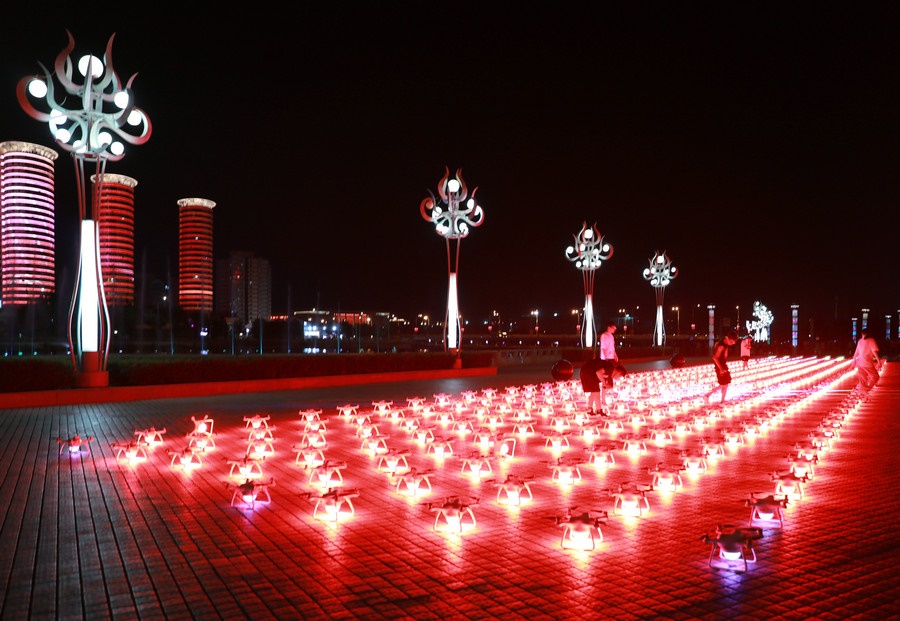 7月30日凌晨1:10,500架無人機(jī)在呼和浩特東河廣場(chǎng)騰空而起,如點(diǎn)點(diǎn)星光組成的動(dòng)態(tài)燈光秀,幻化成20余幅震撼畫面,“建設(shè)亮麗內(nèi)蒙古,共圓偉大中國(guó)夢(mèng)”、“江山就是人民,人民就是江山”、“一心聽黨話,鐵心跟黨走”、“草原兒女心向黨”、“蒙古馬精神”、“亮麗內(nèi)蒙古”、“美麗青城草原都市”等一幅幅絢麗的文字和畫面,配上動(dòng)感激昂的音樂,效果驚艷,現(xiàn)場(chǎng)觀眾贊嘆連連。